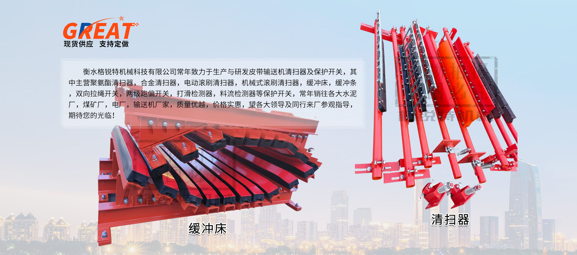衡水格銳特機械科技有限公司常年致力于生產與研發皮帶輸送機清掃器及保護開關,其中主營聚氨酯清掃器,合金清掃器,電動滾刷清掃器,機械式滾刷清掃器,緩沖床,緩沖條,雙向拉繩開關,兩級跑偏開關,打滑檢測器,料流檢測器等保護開關,常年銷往各大水泥廠,煤礦廠,電廠,輸送機廠家,質量優越,價格實惠,望各大領導及同行來廠參觀指導,期待您的光臨!!!